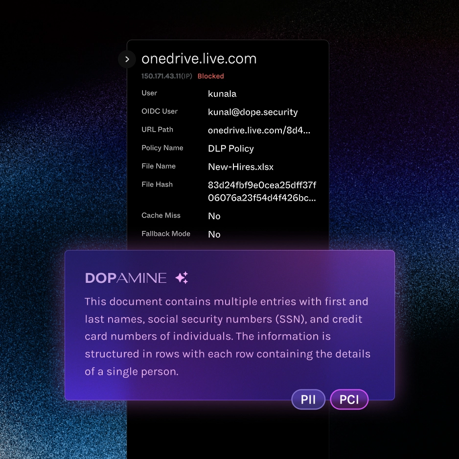 Legacy DLP buried teams in noisy alerts and endless tuning—dope.security replaces it, covering both data in motion (uploads) with DopamineDLP and data at rest (what’s already in Google Workspace/Microsoft 365) with CASB Neural. Together, they protect the two places your sensitive data moves and lives, all without rerouting traffic or babysitting regexes.