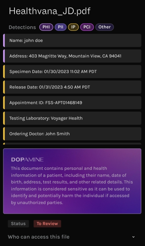 DopamineAI summaries are short, plain-English descriptions that turn noisy DLP signals into human-readable context and next steps. Admins can move from “what happened?” to “what should we do?” on one screen.